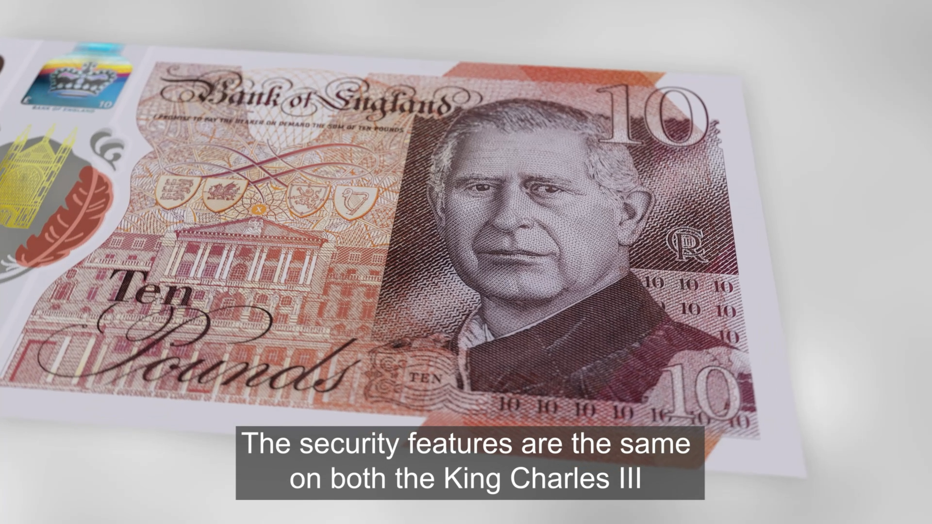 A portrait of Queen Elizabeth II or King Charles III is printed on the window with '£10 Bank of England’ printed twice around the edge.