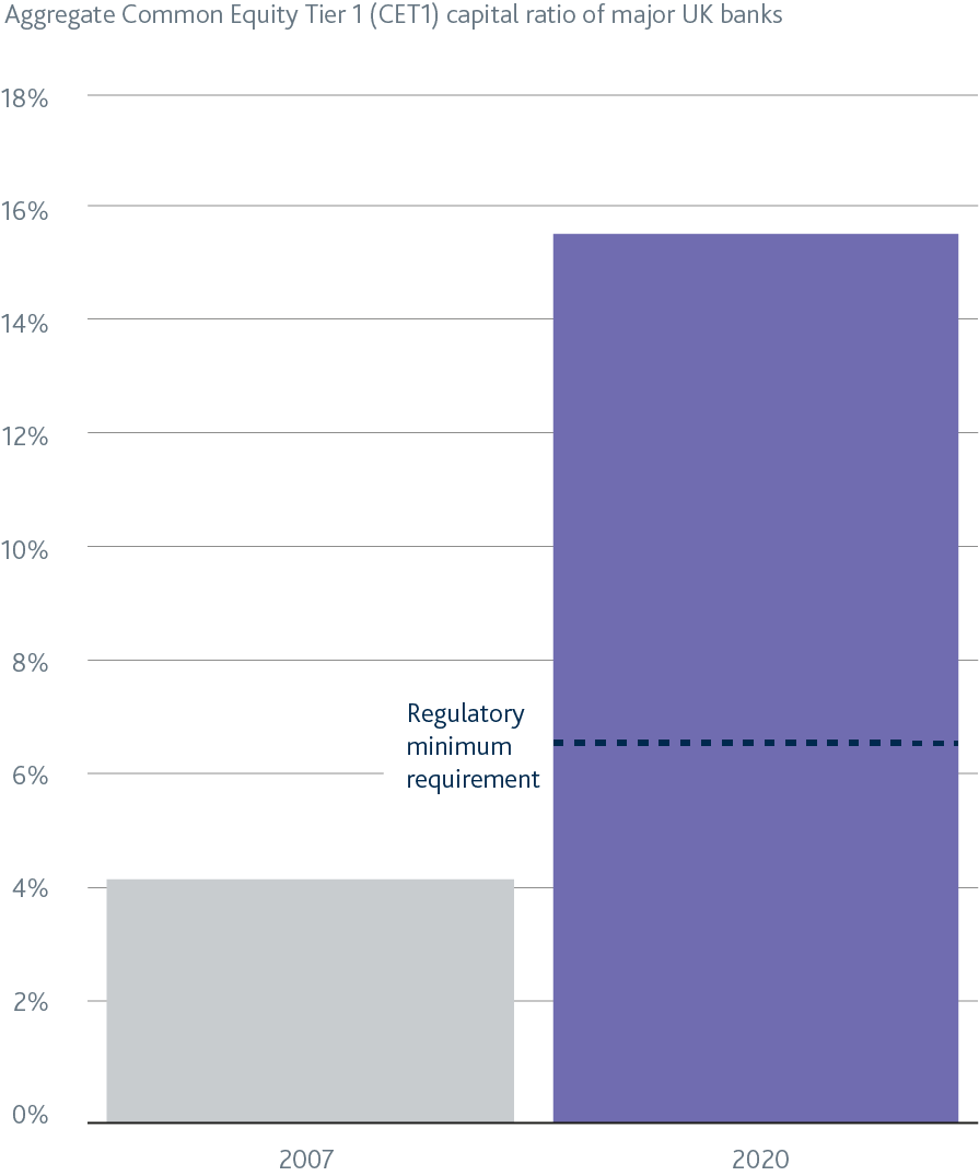 Over the course of 2020, major UK banks’ and building societies’ (‘banks’) aggregate Common Equity Tier 1 capital ratio has increased to 15.8% at end-September, which is over three times higher than at the start of the global financial crisis. Over this period, they have provisioned for £20 billion of credit losses, although the effect on the capital ratio is reduced by the transitional relief of IFRS 9.