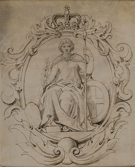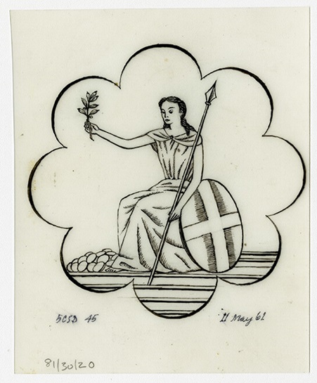 This is the earliest example in our collection. She holds a shield and olive branch and watches over a ‘bank of money’, symbolising the wealth of the nation.