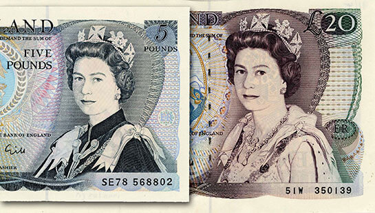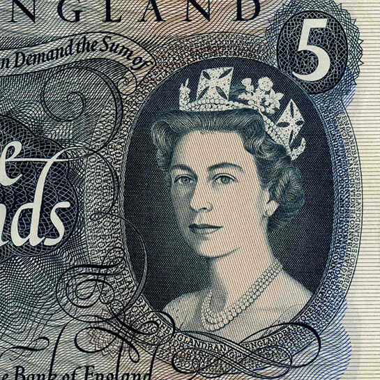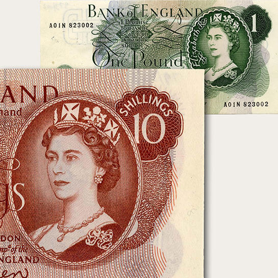 The series of notes issued in the 1970s featured two different portraits of HM Queen Elizabeth II. One version was used for £1 and £5 notes, and another for the ‘high sum’ notes of £10, £20 and £50.