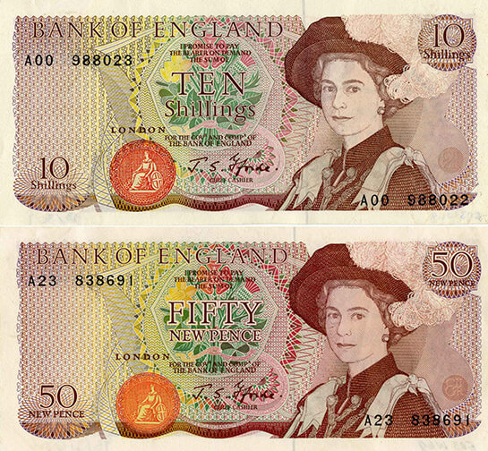 Instead, a 50p coin was created as part of the new system of decimal coinage. Ten shilling notes were withdrawn in 1970, and the 50p note was never issued.