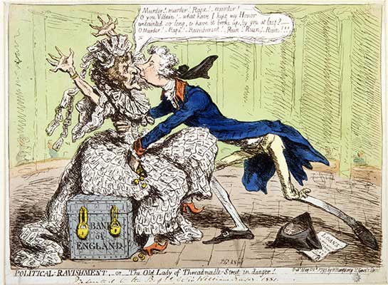 The Bank of England is sometimes called the ‘Old Lady of Threadneedle Street’. The name stems from this caricature by James Gillray (1756–1815).