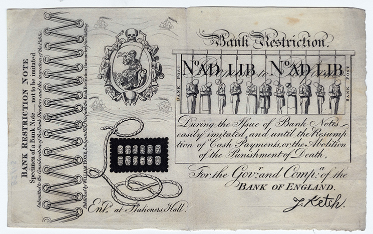 Designed by artist George Cruikshank (1792–1878) and published by William Hone (1780–1842), this imitation banknote highlights the harshness of the anti-forgery laws. The Chief Cashier's signature has been replaced by the infamous former public executioner Jack Ketch (d.1686).