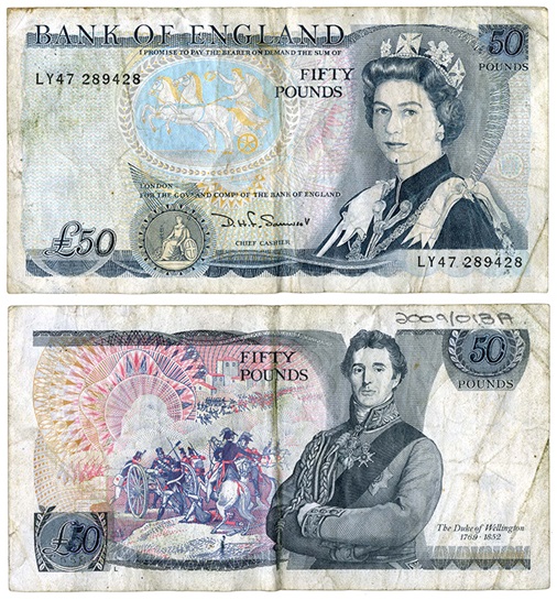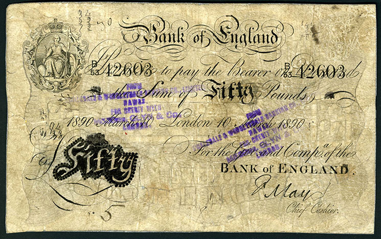The £50 banknote at this time featured former Governor of the Bank of England, Sir John Houblon (1632–1712). This was unlikely to have been a convincing counterfeit.