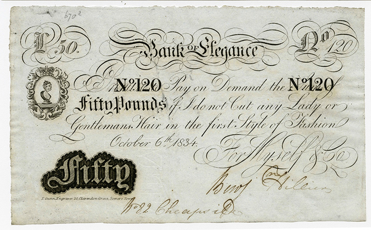 This one was made to promote a barber, who promises to ‘Pay on Demand the sum of fifty pounds if I do not cut any Lady or Gentleman’s Hair in the first Style of Fashion’.