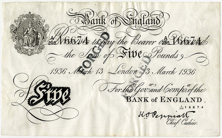 The notes, including this counterfeit £5, were made by prisoners of war in a Nazi concentration camp. The notes were accurate counterfeits and the Bank of England withdrew all notes above £5 as a precaution.