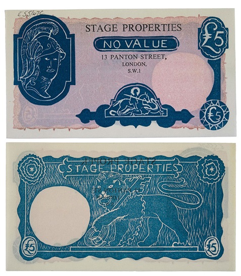 This imitation banknote, produced by a theatrical property maker based in Panton Street, London, is intended to represent a blue £5 Series B banknote. It was surrendered to the Bank of England in 1958.