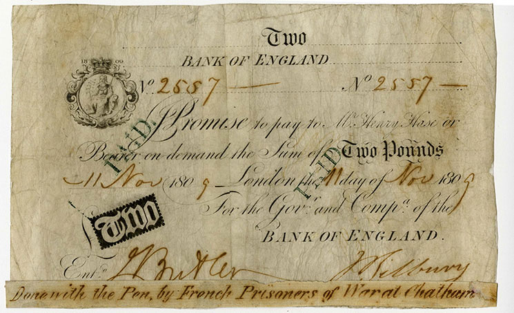 This hand-drawn counterfeit £2 banknote was produced by a French prisoner of war, held in Chatham, Kent. Many thousands of French prisoners of war were held in England during the Napoleonic Wars (1803–1815).