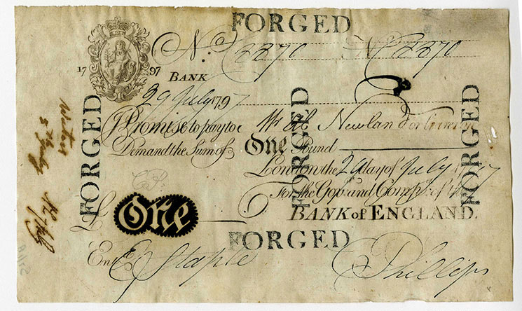 This printed counterfeit £1 banknote was seized by Bank of England clerks and stamped with the word ‘forged’.
